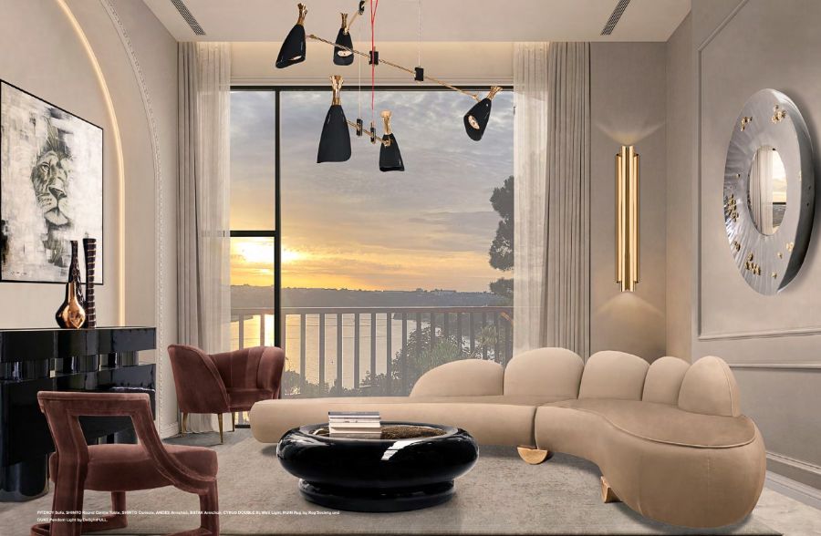 Contemporary entryway design with oval mirror and a sculptural console by Boca do Lobo.