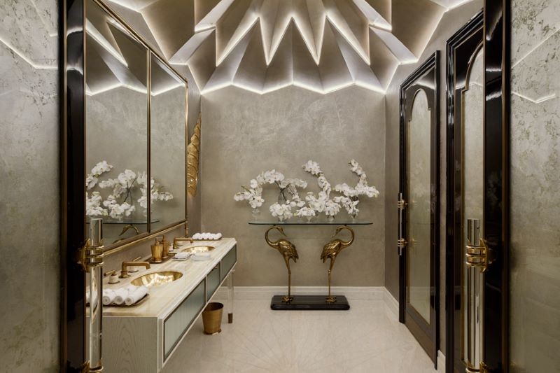 When we enter the kids’ room we are immediately drawn to the sleeping area. The wallpaper with the Led lights that form a little astronaut sitting on the moon immediately drawn us. With a color palette that ranges between light grey and pastel shades, the cloud bed is the chosen piece that does deliver the sensation of levity and being lost in space and imagination. The moon rug matches perfectly with the theme of the bedroom as well as the Cloud Bed with an elegant grey velvet headboard.