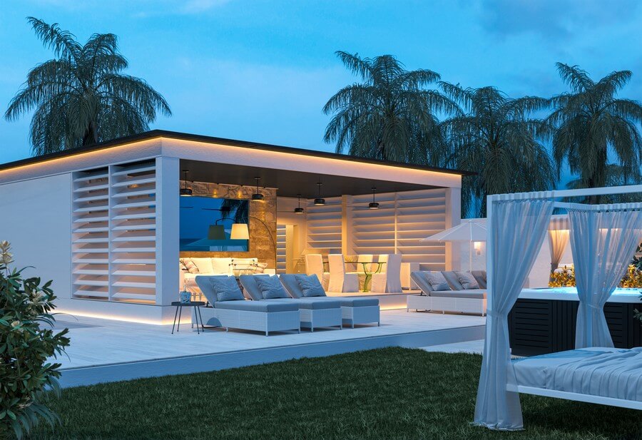 Complementing with the gold nuances sprinkled all over the house and in the living room, the lighting accessories completely stand out from the deep green walls and ceiling. Both the Waterfall II Big Wall Lamp from Luxxu and also the Niku Pendant Light from Brabbu were the stand-out pieces, bringing to light a superb atmosphere. Finally, a piece that you may not notice immediately because its natural shapes fit so perfectly with the walls and mirror, but the Huang Sideboard from Brabbu is there to be a compliment in the modernist approach of the room.