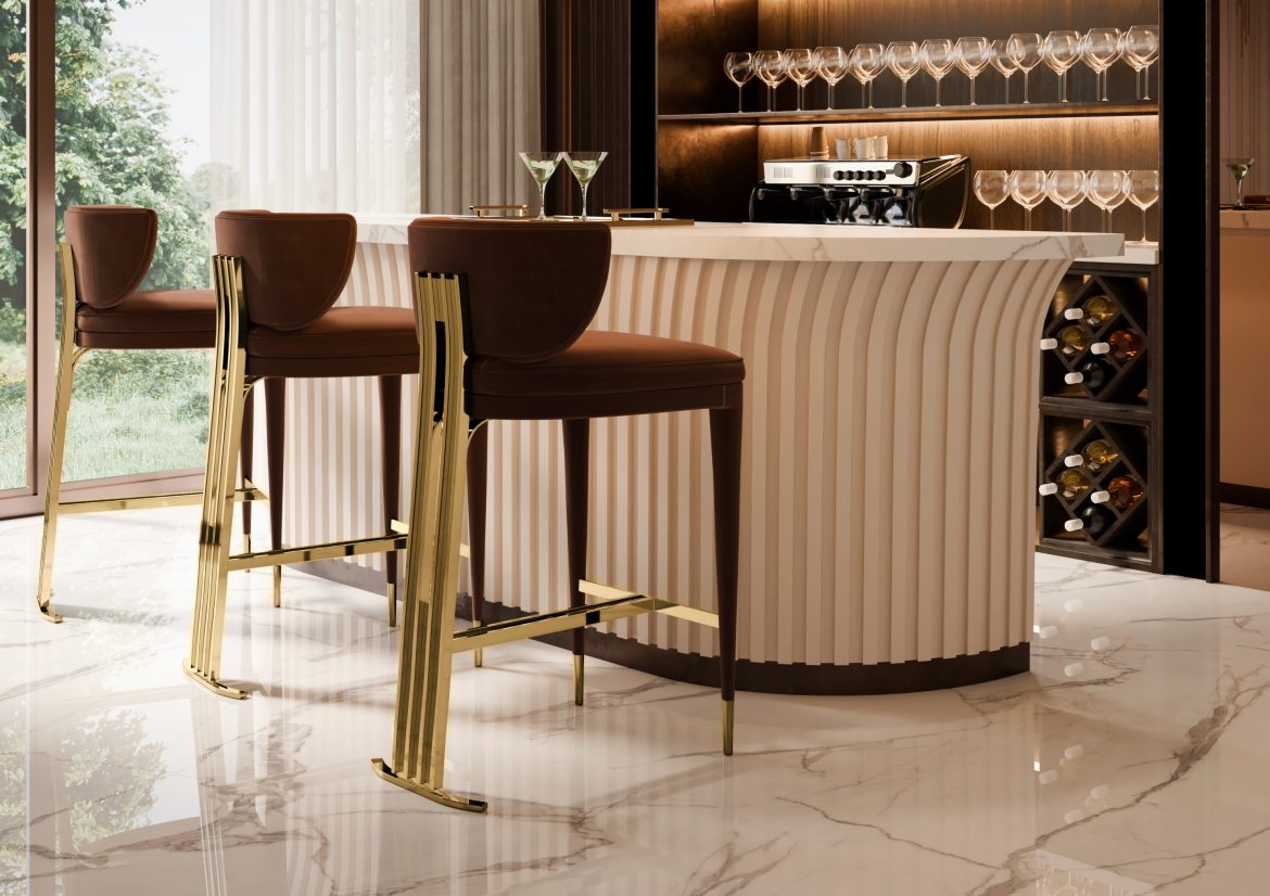 The boiserie on the walls and ceiling was meant to turn this otherwise simple architecture into a detailed and regal look. The sculptures create the exclusiveness and artsy look that when combined with the walls, ceiling, and even the dark wood of the flooring, captures a feeling of royalty, evoking almost an 18th-century vibe. What elevates this room to a true art form of interior design is the play on contemporary furniture, materials, fabrics, and finishes. This Living Room is composed of some of Covet House’s most exquisite brands, which not only contributed to an opulent aura for the room but also turned it into a pure Art Gallery.